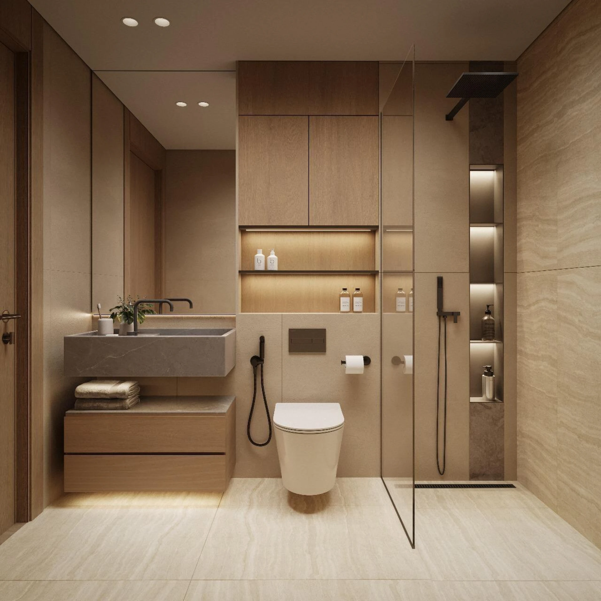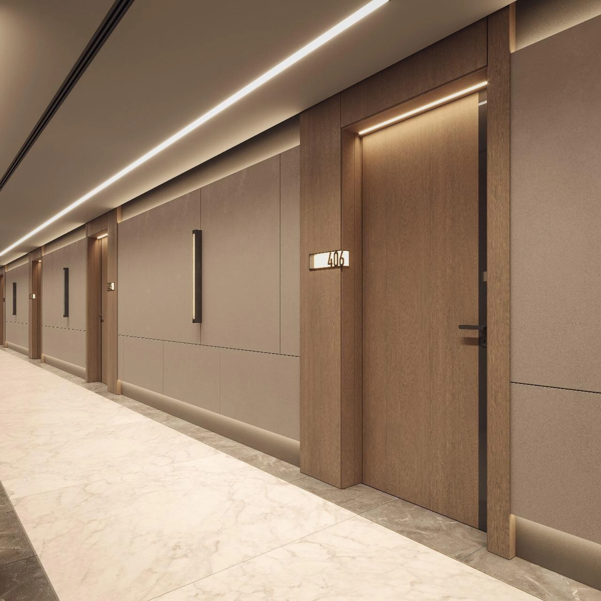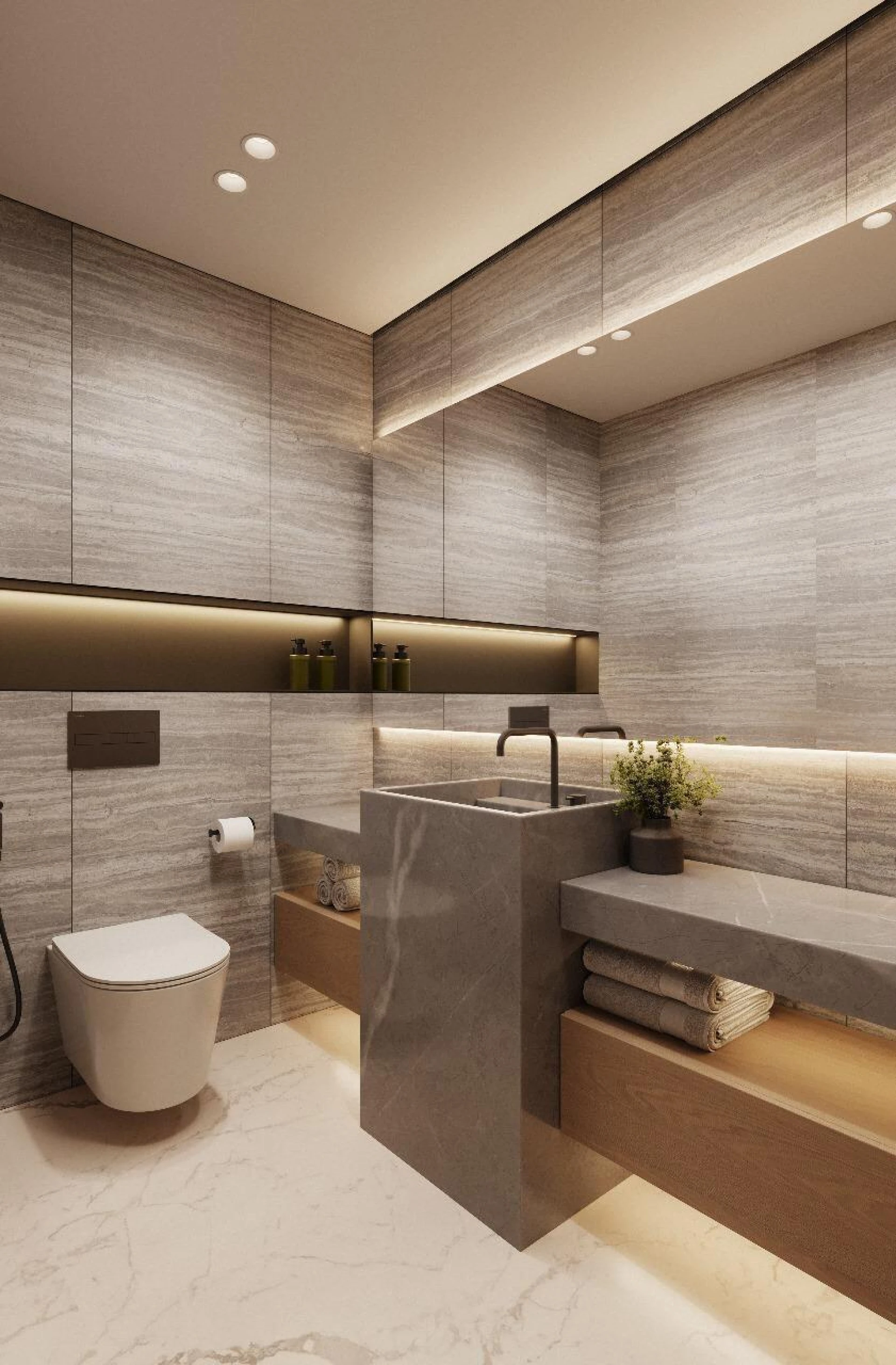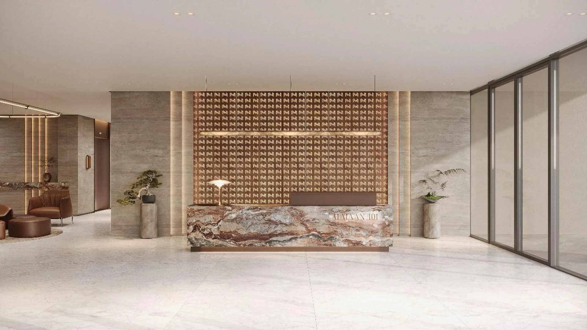 Wejdź do środka, aby odkryć wnętrza ozdobione wypolerowanym trawertynem, marmurem Roso Levanto i ciepłymi metalicznymi akcentami w odcieniu szampana. Wygięte szklane elementy z brązu i teksturowane ściany z trawertynu tworzą scenerię dla spersonalizowanego oświetlenia i spokojnej atmosfery, ucieleśniając prawdziwy luksus na każdym kroku. Almaan 101 jest stworzony nie tylko jako miejsce zamieszkania — ale jako żywy, oddychający wyraz współczesnej przepychu.
