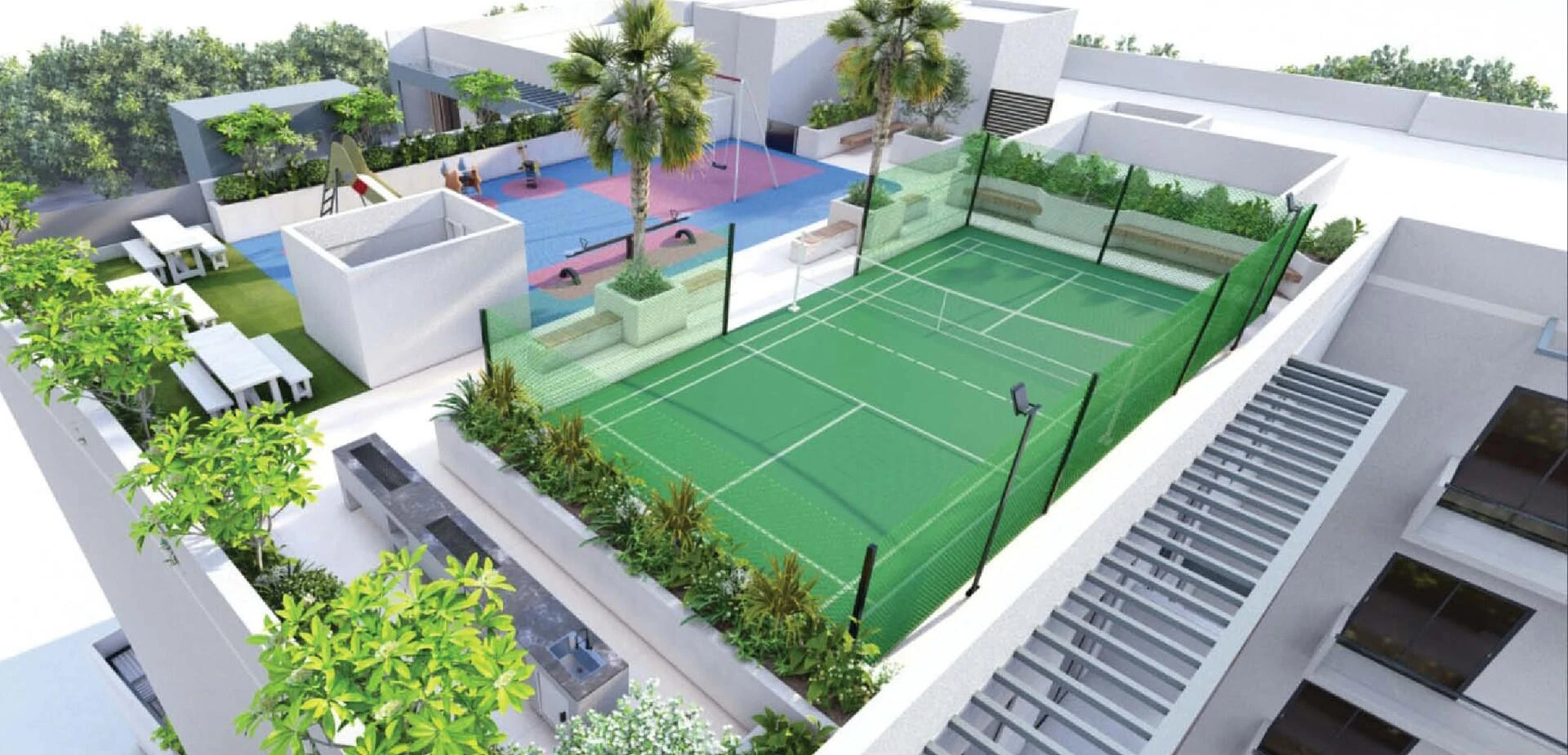 Podnieś swój codzienny standard dzięki szerokiej gamie udogodnień na terenie kompleksu. Mieszkańcy mogą korzystać z w pełni wyposażonego centrum fitness, odprężającego basenu oraz dedykowanego kortu do badmintona. Przemyślane ogrody i przytulne miejsca na grilla zapewniają idealną przestrzeń do relaksu, integracji i budowania poczucia wspólnoty.
