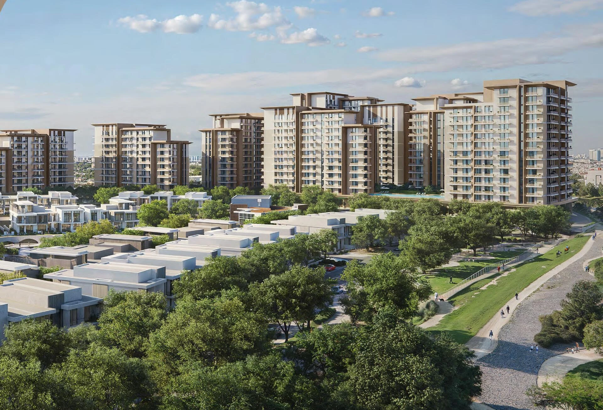 Expo Valley Views to nowoczesna społeczność mieszkaniowa położona w tętniącym życiem sercu Expo City Dubai, gdzie architektura harmonijnie łączy się z naturalnym krajobrazem. Tutaj każdy detal odpowiada unikalnym fałdom i konturom terenu, tworząc przestrzenie mieszkalne, które wydają się zarówno podniesione, jak i organicznie związane z otoczeniem.