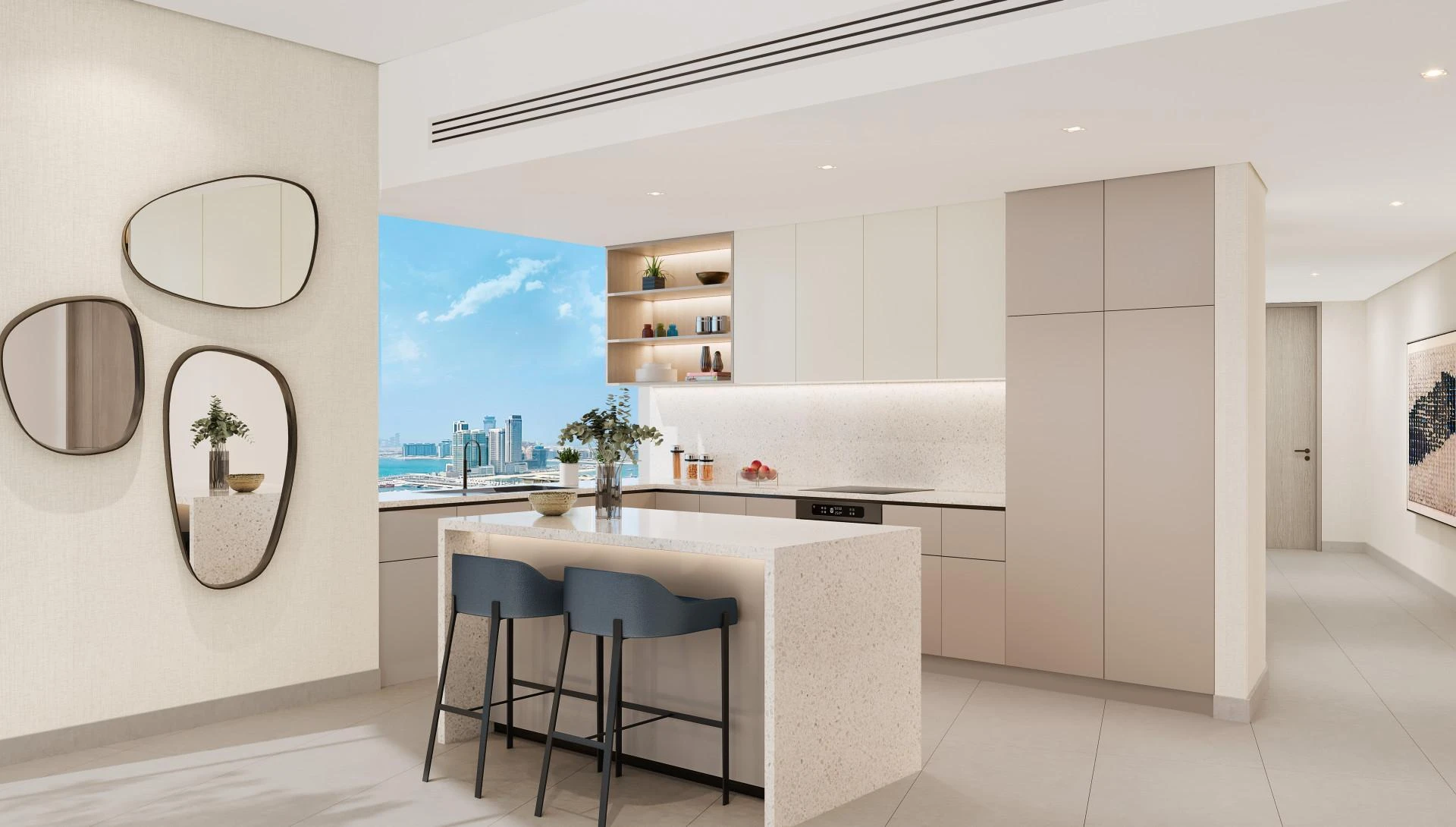 Wejdź do środka i doświadcz bezproblemowego połączenia między życiem wewnętrznym a zewnętrznym. Okna od podłogi do sufitu i przestronne balkony otaczają zapierające dech w piersiach, panoramiczne widoki - niezależnie od tego, czy jest to ikoniczna sylwetka miasta, lśniące wody Zatoki Arabskiej, czy bujna zieleń i tętniące życiem parki poniżej. Każdy wschód i zachód słońca to prywatne widowisko z sanktuarium własnego domu.